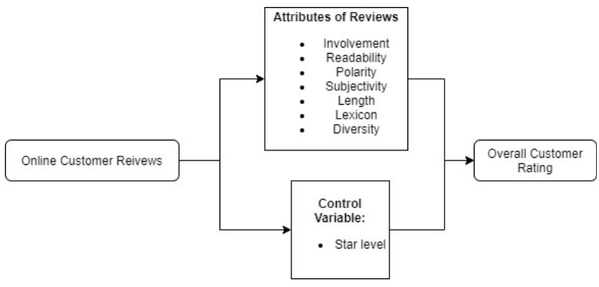 Customer Overall Rating = β0+β1 Involvement +β2 Readability +β3 Polarity +β4 Subjectivity +β5 Word Count +β6 Lexicon + β7 Diversity + β8 Star Level